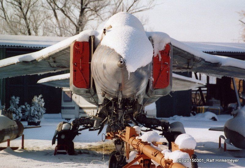 Auch bei der „329“ mussten wir mit der Restaurierung zügig beginnen, da vor allem die Tragflächenkästen der MiG-23 zu schnellem Korrodieren neigen. Nach anderen Arbeiten, wie z.B. Reproduzieren des großen Deckels auf der linken Seite am Bug (mit Quali-Abzeichen) und Aufrüsten des Cockpits, ist sie wieder in relativ gutem Zustand. „Lediglich“ der Anstrich muss in naher Zukunft erneuert werden.